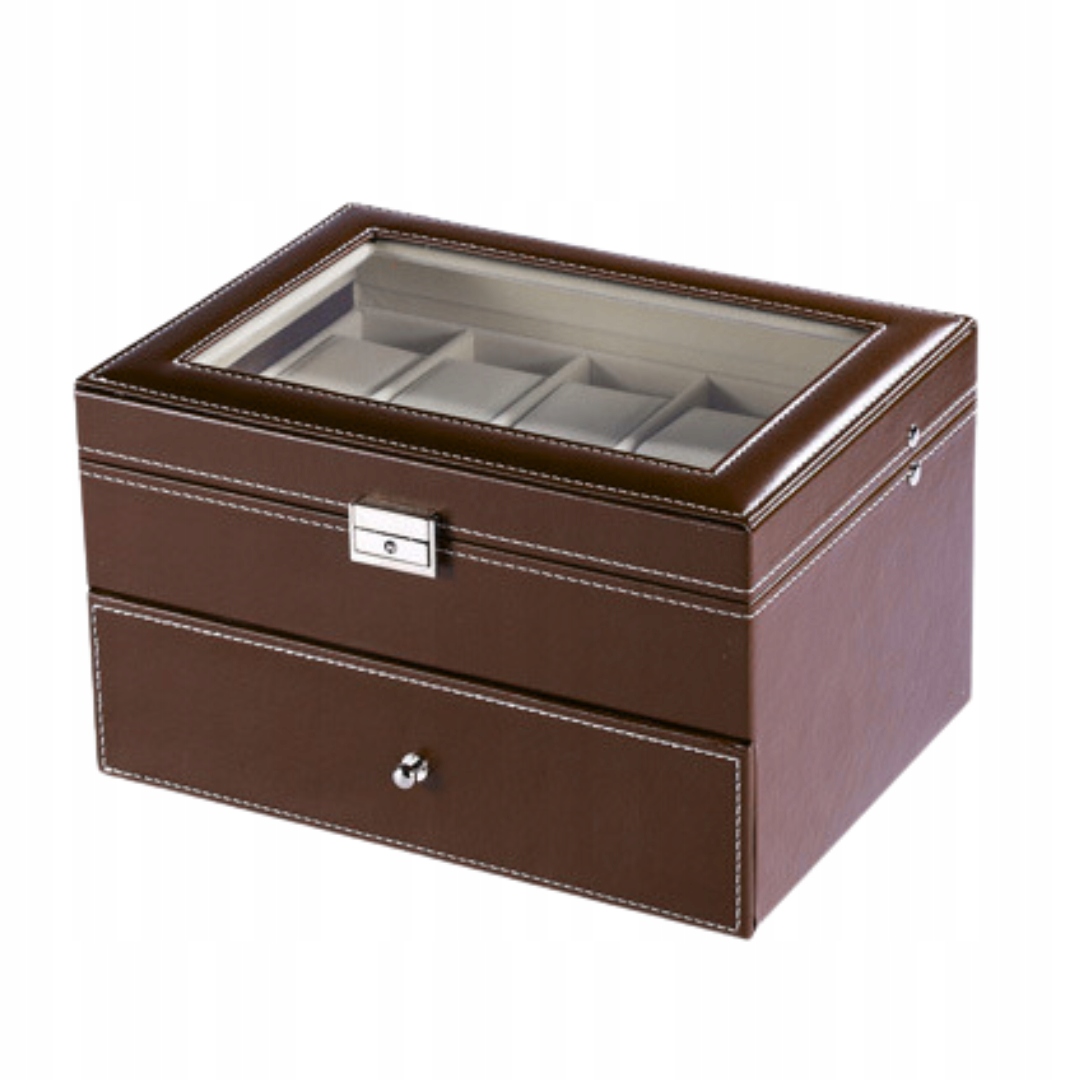 Etui składa się z dwóch poziomów. Górne piętro mieści 10 zegarków, a dolna wysuwana szuflada posiada kolejne 10 przegródek. Wnętrze wyłożone jest miękkim beżowym materiałem, który delikatnie chroni zegarki przed uszkodzeniami. Zamknięcie na kluczyk zapewnia dodatkowe bezpieczeństwo, gwarantując ochronę cennej kolekcji przed przypadkowymi otwarciami.