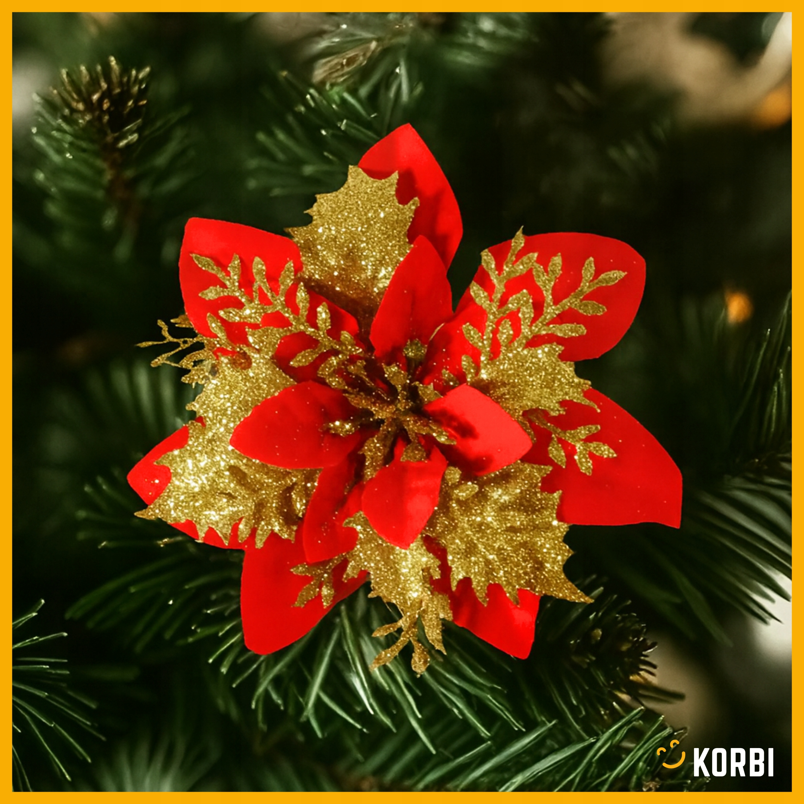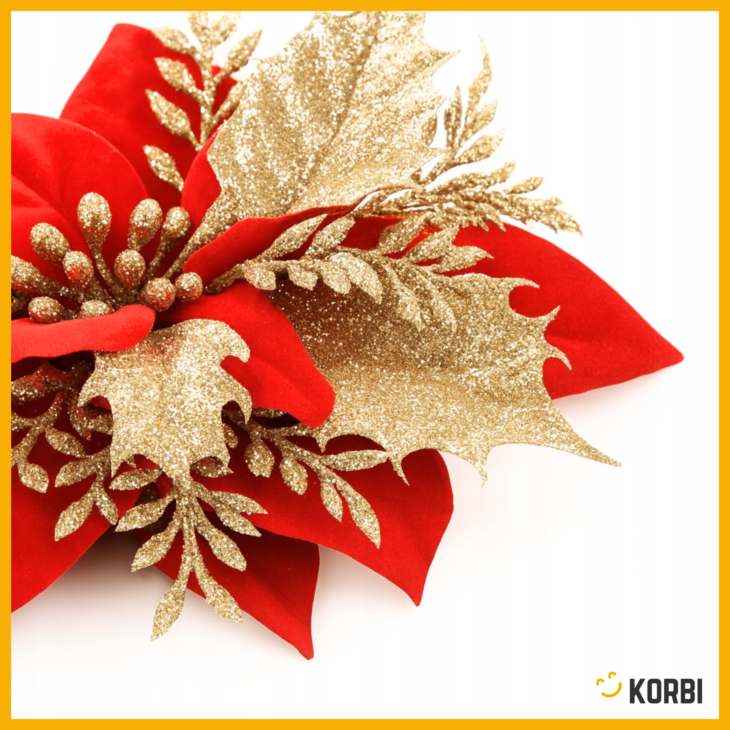 Poinsecja w czerwono-złotej odsłonie to ponadczasowy symbol Bożego Narodzenia. Świetnie sprawdzi się jako główny akcent w świątecznych dekoracjach lub delikatne uzupełnienie choinki i stołu.