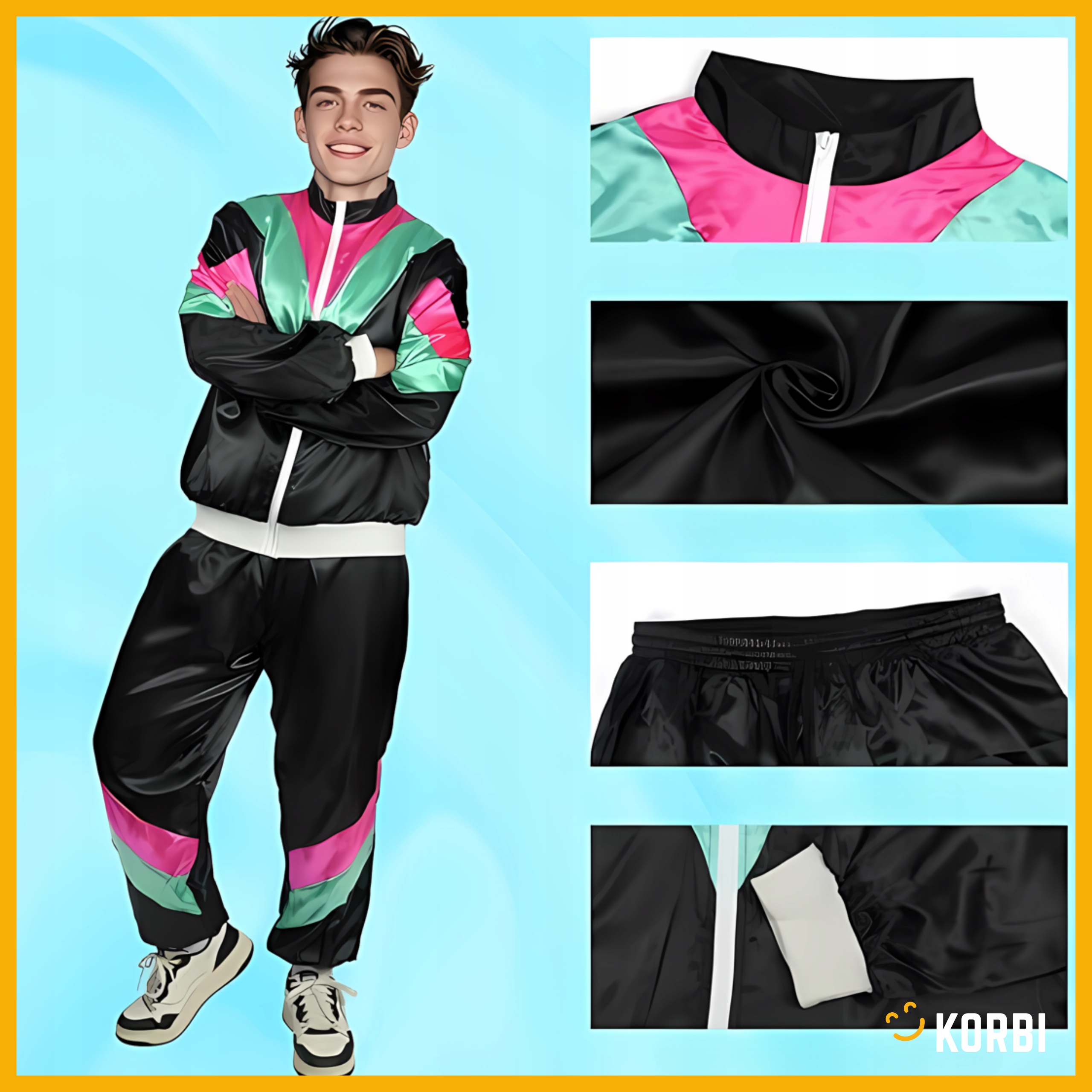Stylowy i wygodny strój w klimacie lat 80. To idealna propozycja na imprezy tematyczne, bale przebierańców, wieczory panieńskie czy karnawał. Czarne dresy z charakterystycznymi detalami przywołują ducha złotej ery hip-hopu i klubowych rytmów disco. W tym przebraniu bez trudu wcielisz się w postać tancerza, rapera lub fana ulicznego stylu retro.