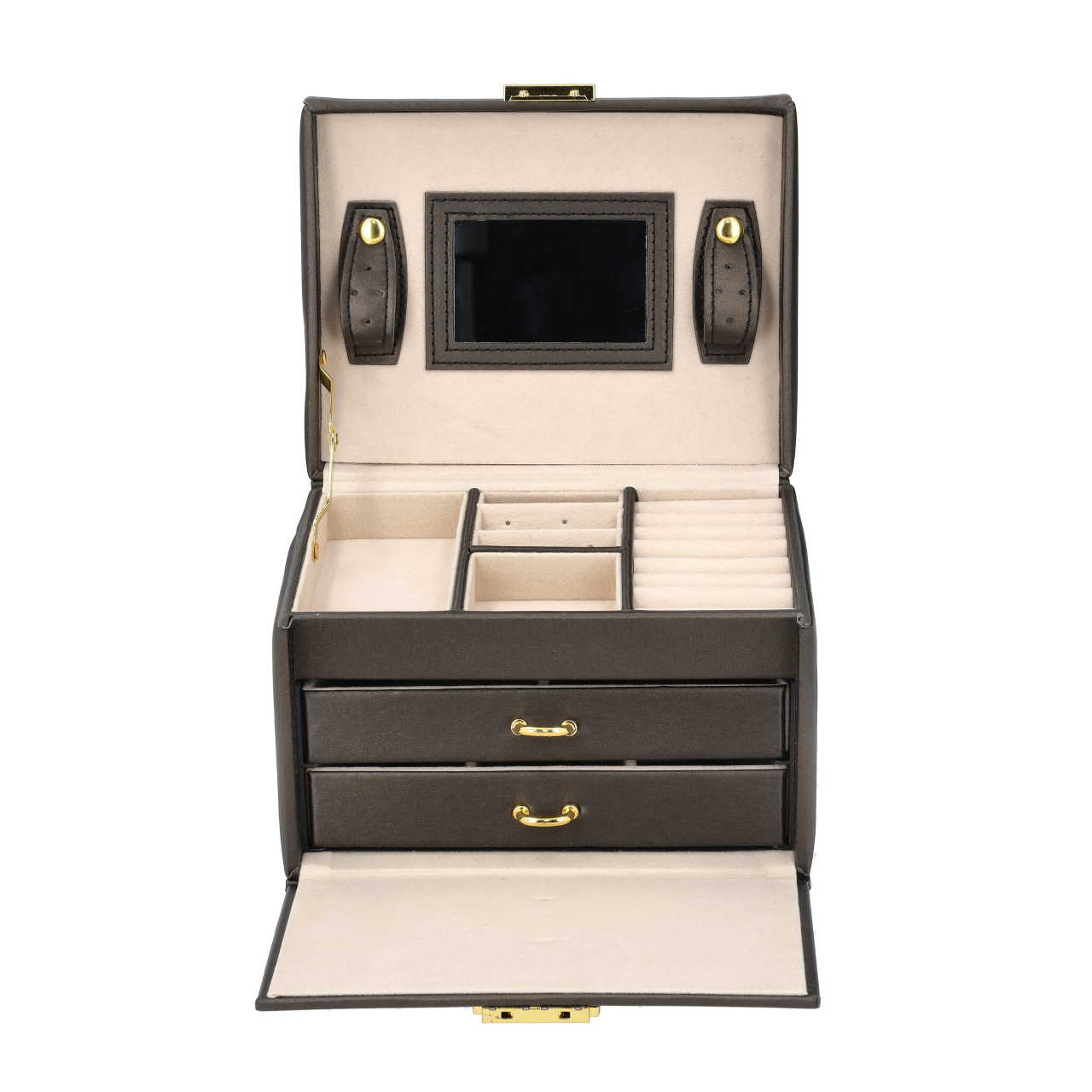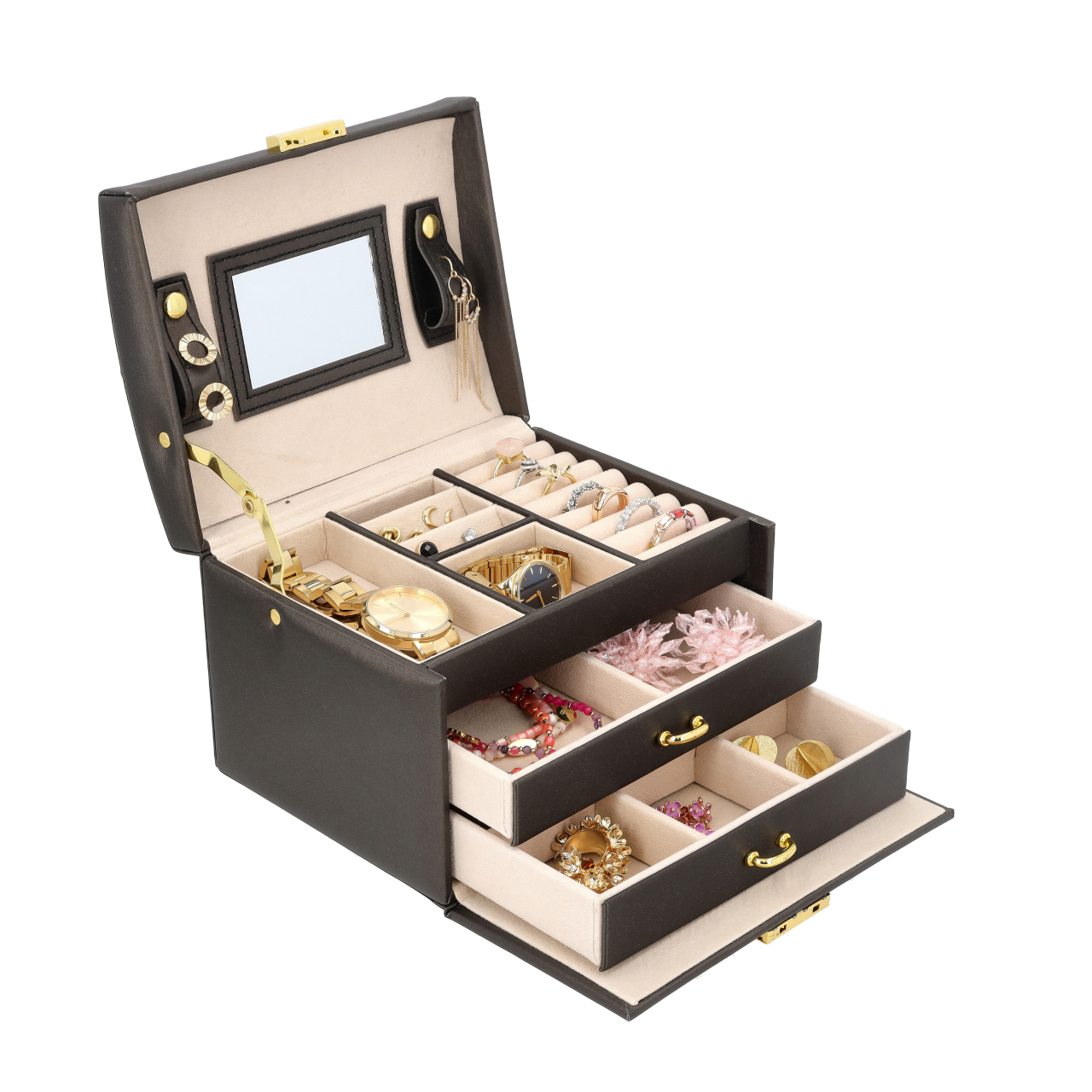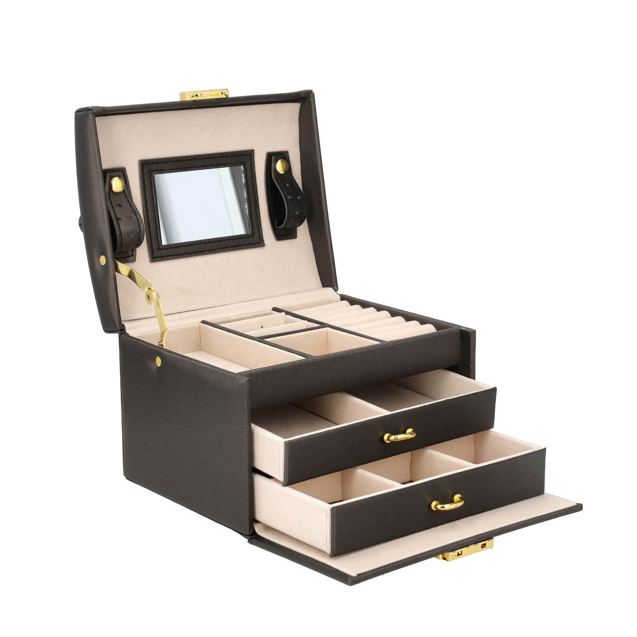 - Najwyższe piętro – Miejsce na pierścionki i kolczyki, wyposażone w lusterko.