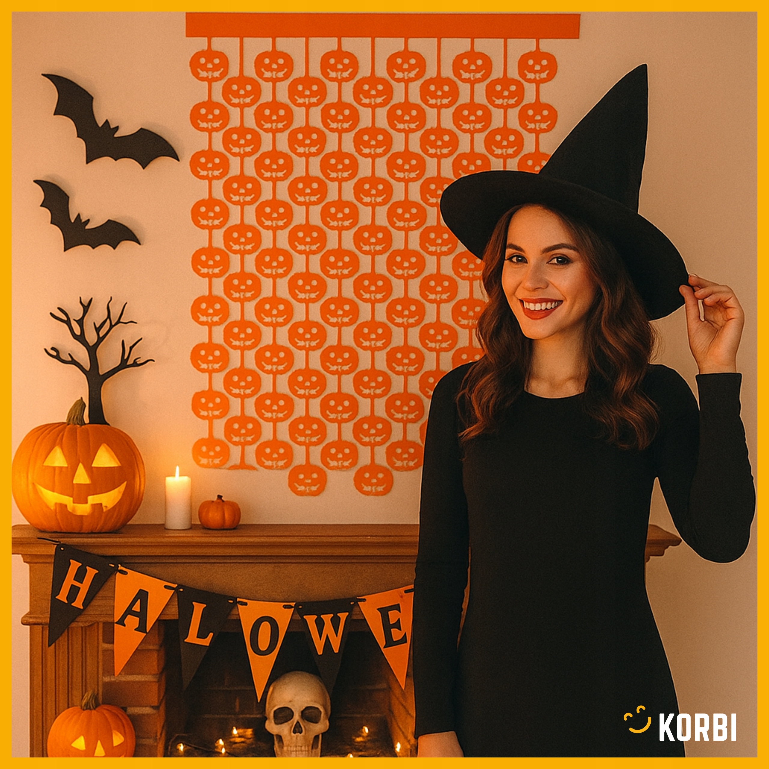 Kurtyna z dyniami sprawdzi się nie tylko w domu, ale i w salach zabaw, lokalach czy w ogrodzie. Może być elementem scenografii, tłem do zdjęć lub dekoracją wejścia, wprowadzając gości w odpowiedni nastrój już od progu.