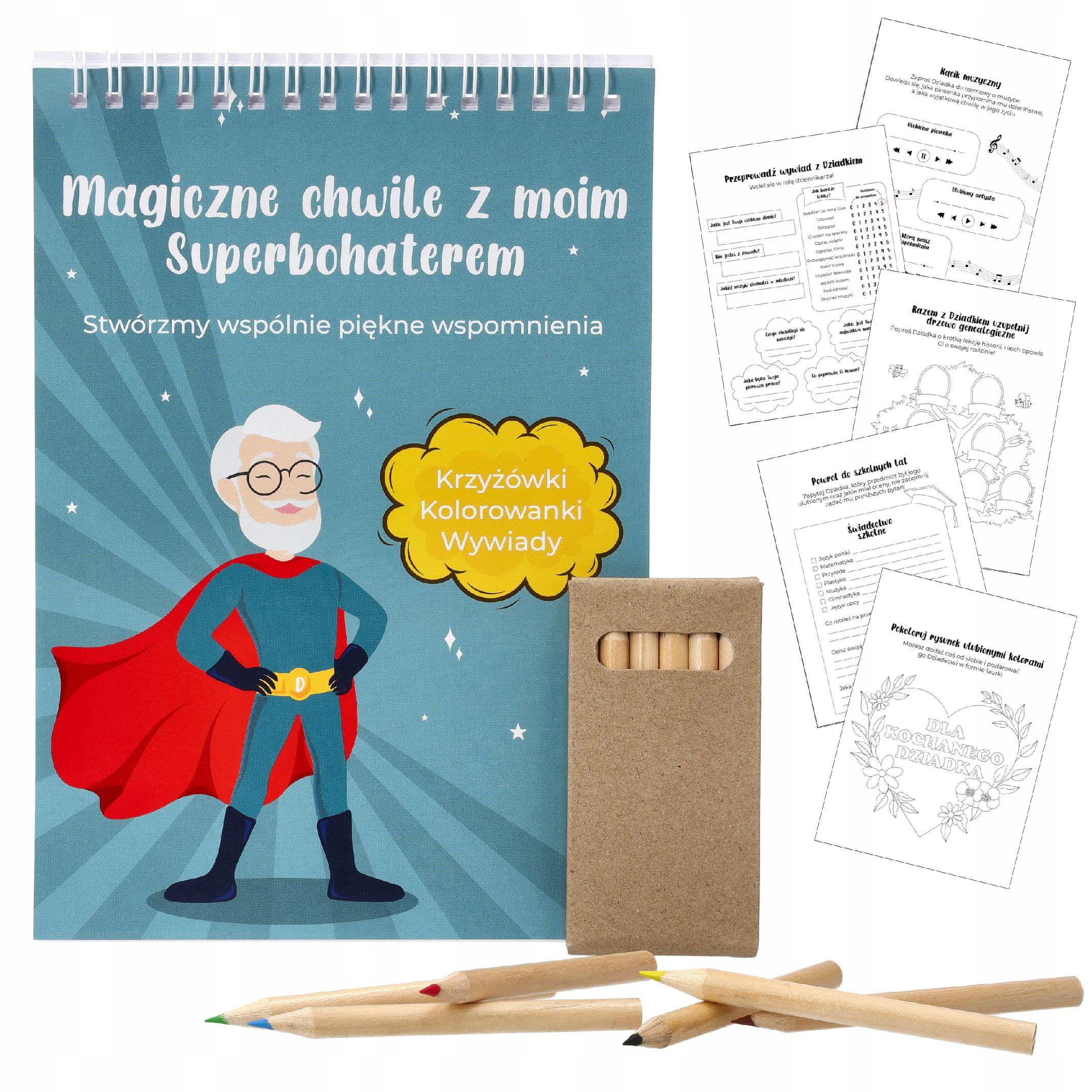 ✅ W środku znajdziesz 19 stron pełnych kolorowanek, wywiadów i uzupełnianek, które pozwalają spędzić czas z Dziadkiem w wyjątkowy sposób. To doskonały sposób, aby lepiej poznać jego historię, wspólnie stworzyć unikalną pamiątkę i wywołać uśmiech na jego twarzy. Dołączony zestaw mini kredek w 6 kolorach sprawia, że kalendarzyk jest gotowy do działania już od pierwszej chwili.