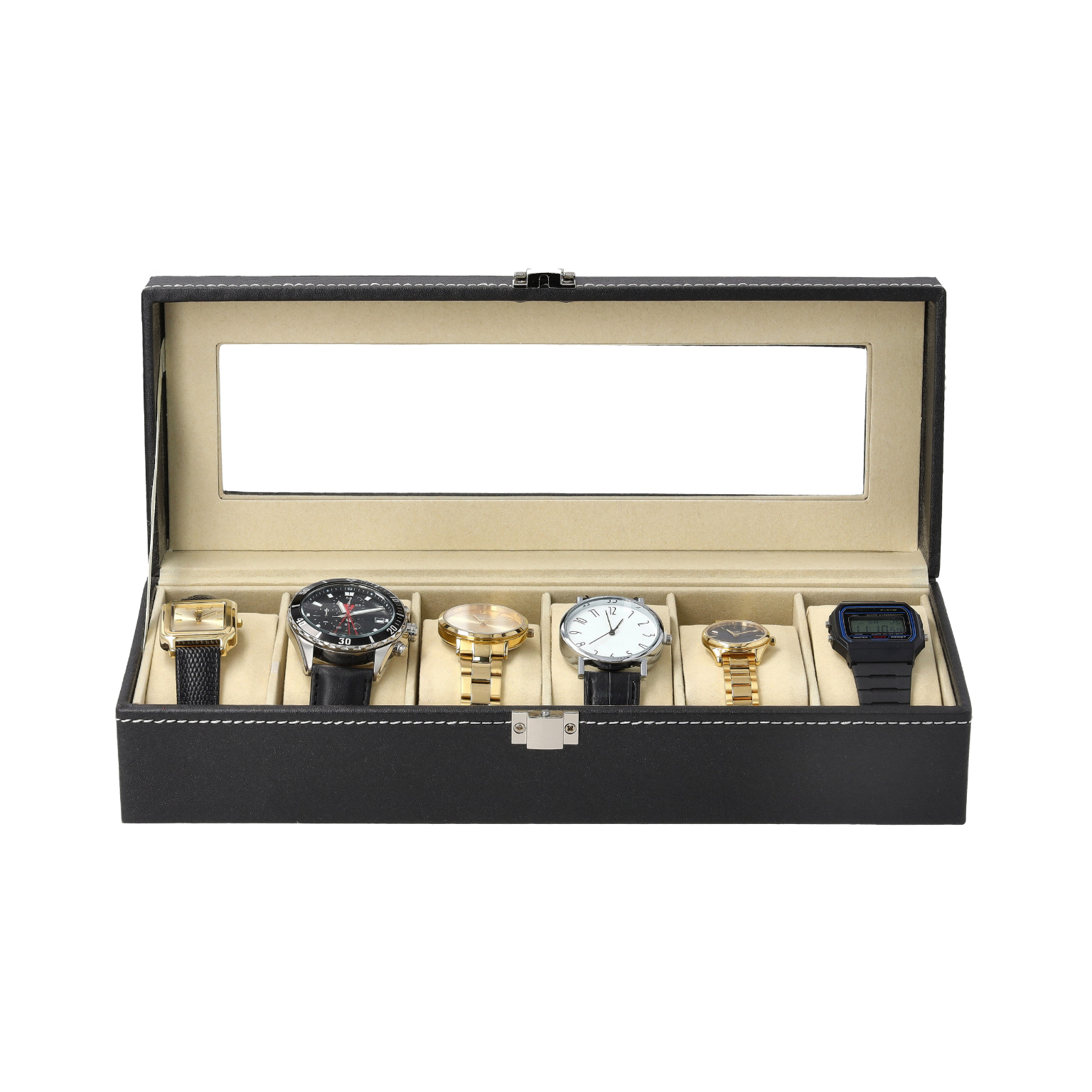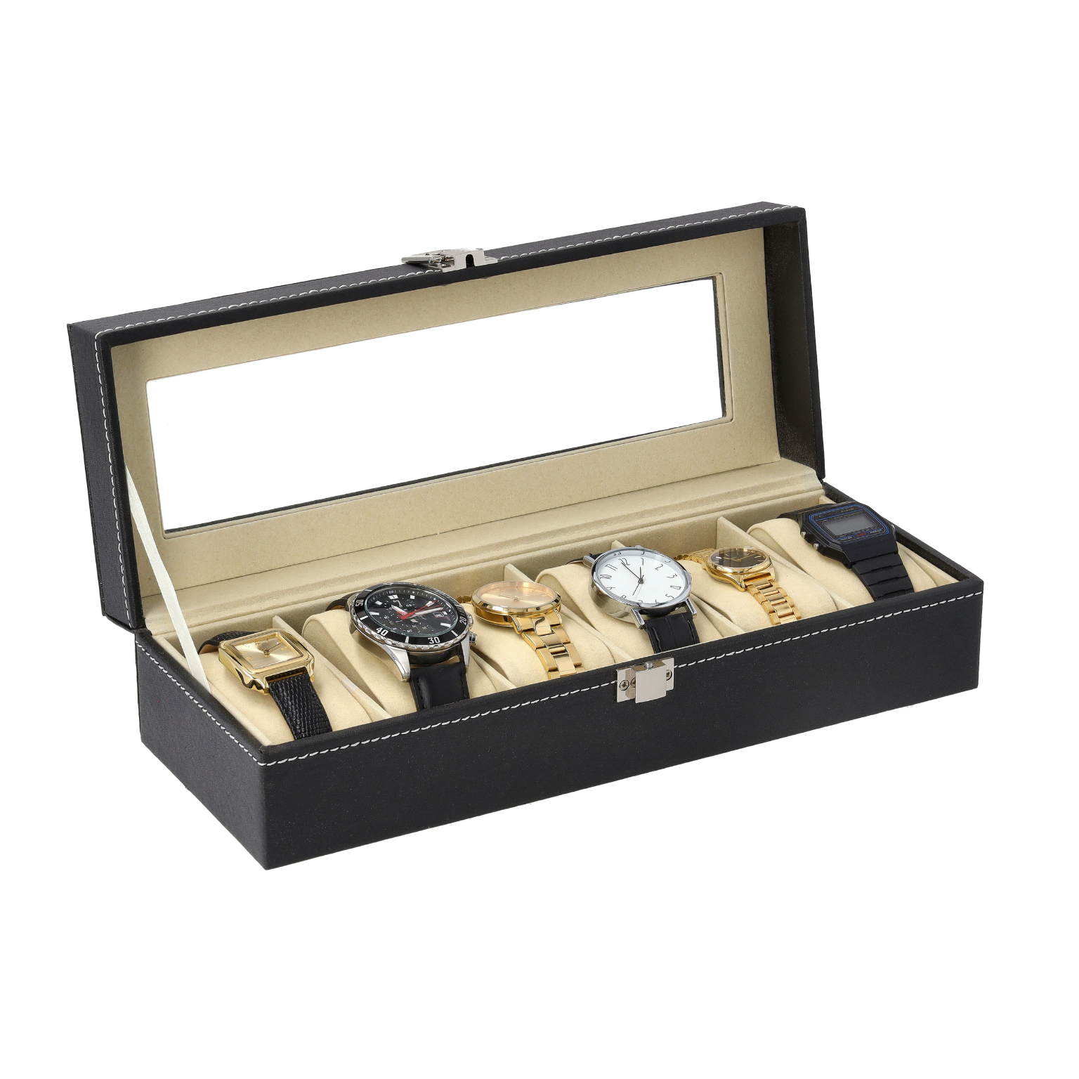 - Wysoka jakość wykonania – Etui pokryte wytrzymałą ekoskórą, wyłożone miękkim kremowym materiałem, który chroni zegarki przed zarysowaniami.