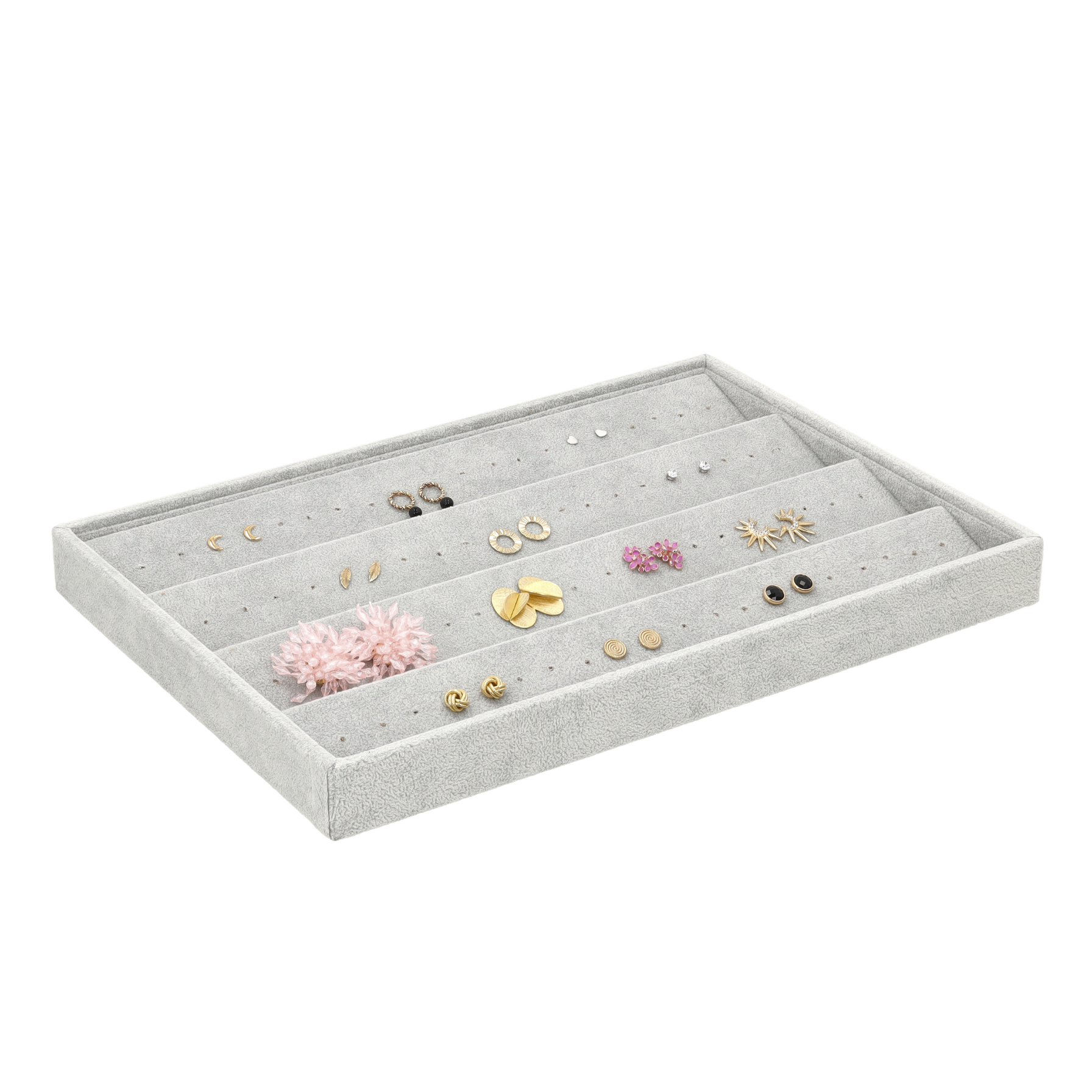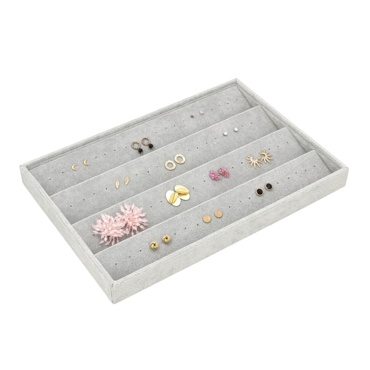 - Praktyczne przechowywanie: 4 pochylone ścianki umożliwiają przechowywanie różnych rodzajów kolczyków – od sztyftów po drobne wisiorki.