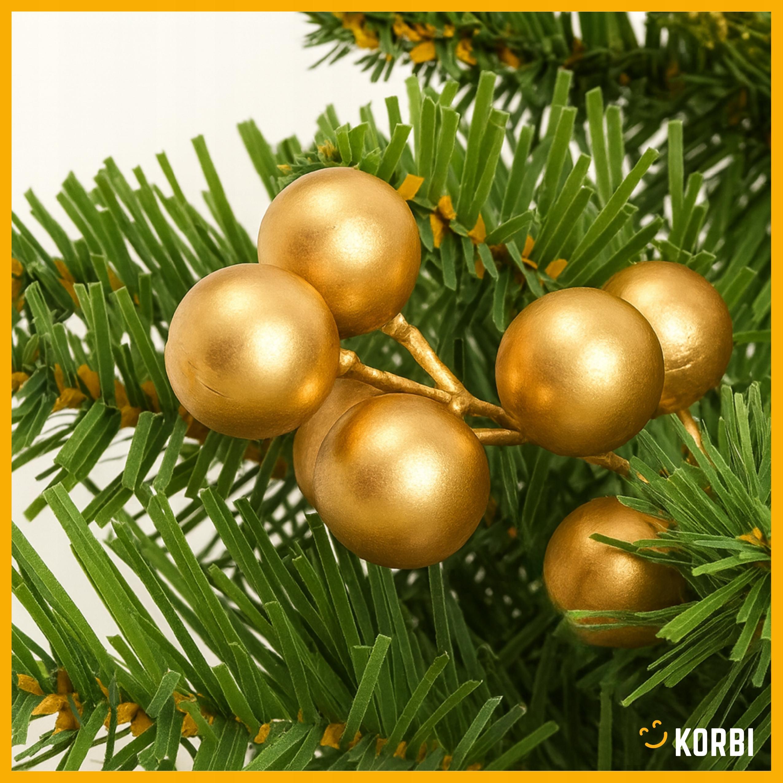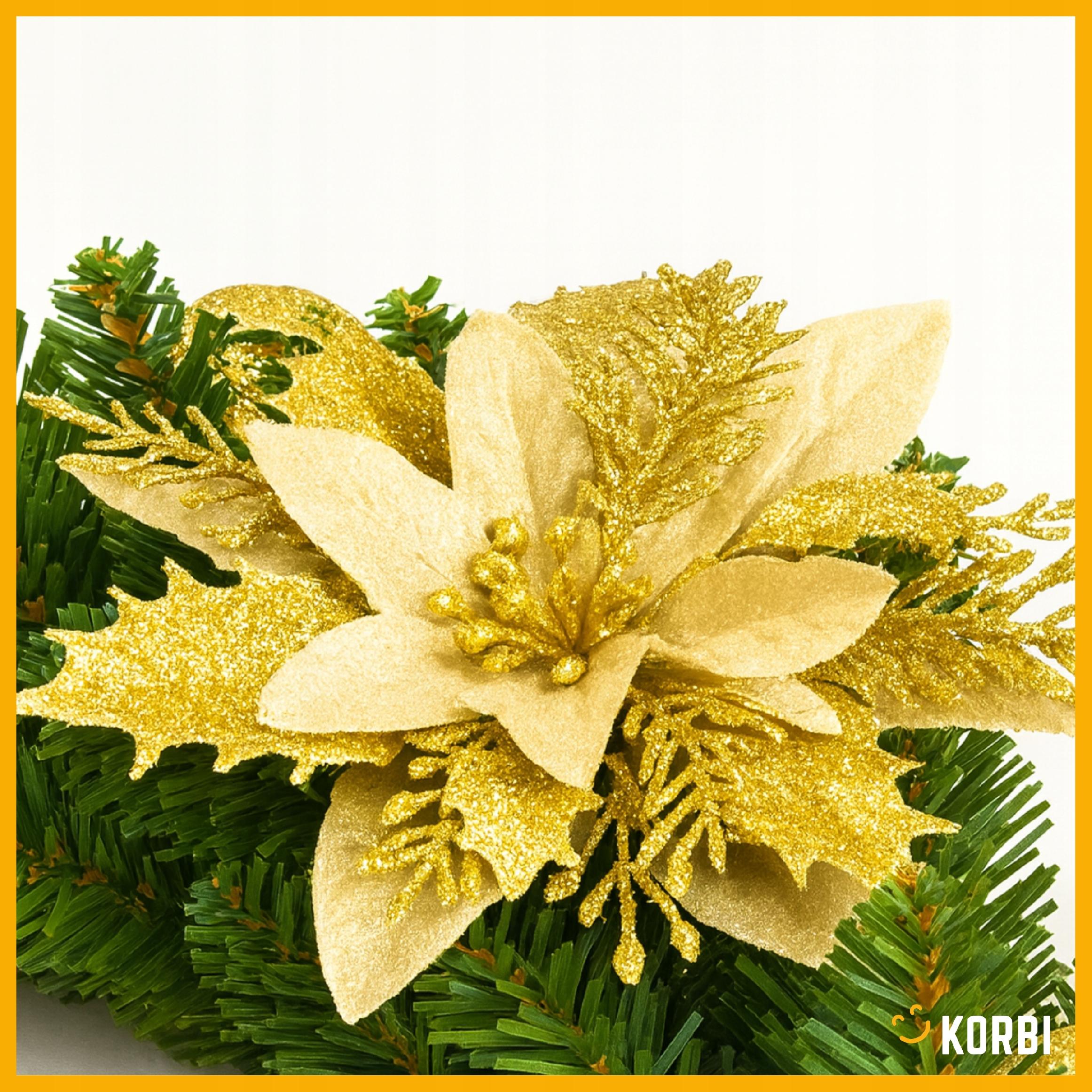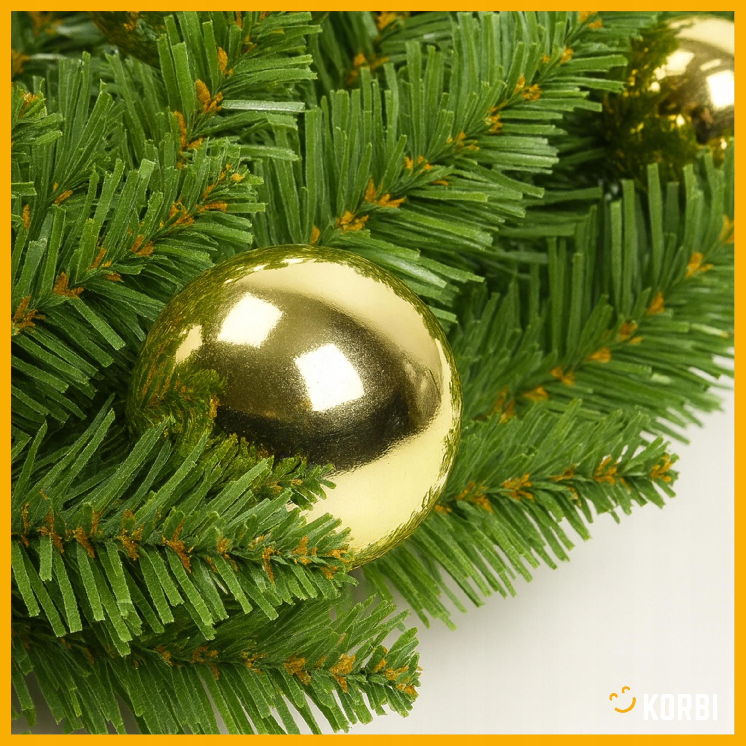 Ten piękny wieniec bożonarodzeniowy to kwintesencja świątecznej atmosfery. Dzięki połączeniu zielonych igliwia, złotych bombek, owoców jarzębiny i kwiatów gwiazdy betlejemskiej, dekoracja zachwyca bogactwem detali i naturalnym wyglądem. To ozdoba, która przyciągnie wzrok i podkreśli wyjątkowy charakter Bożego Narodzenia.